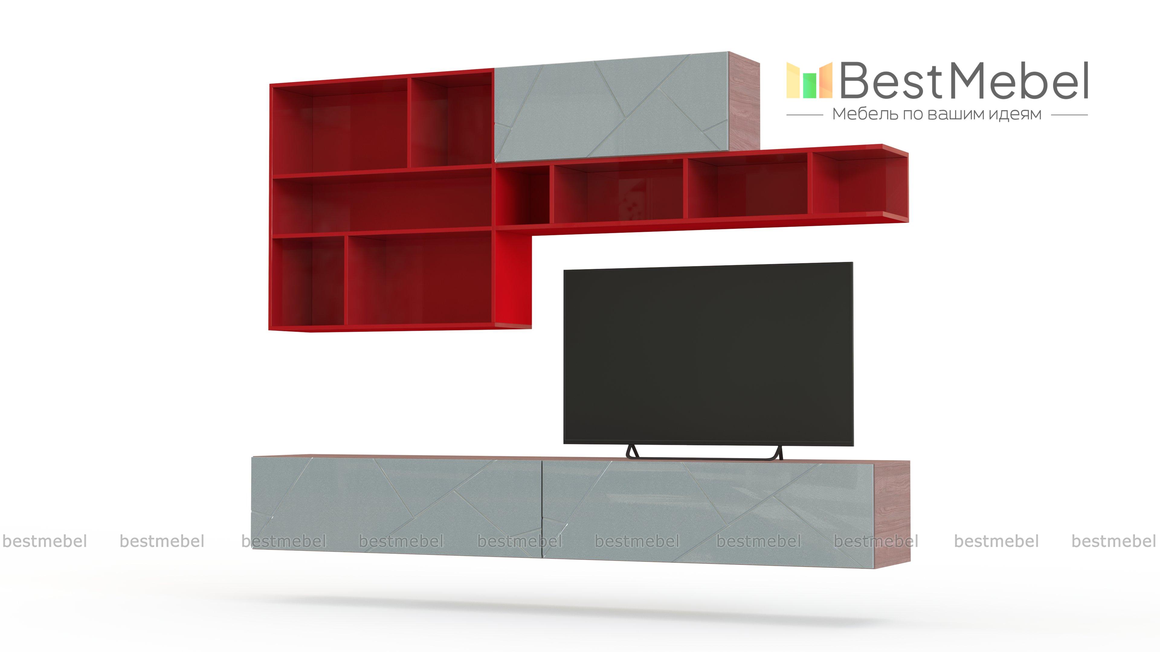 Стенка для гостиной Санни 9 BMS займет центральное место в интерьере и поможет нестандартно оформить зону ТВ. Модульная композиция привлекает сочетанием лаконичного дизайна и оригинального цветового решения – корпус серых тонов, черные глянцевые фасады с геометричной фрезеровкой и яркие акценты полок. В комплект входят навесные модули – две тумбы с выдвижными ящиками, шкафчик с откидной вверх дверцей и открытые книжные полки. Купить стенку для гостиной Санни 9 BMS приглашаем на сайт нашего интернет-магазина.