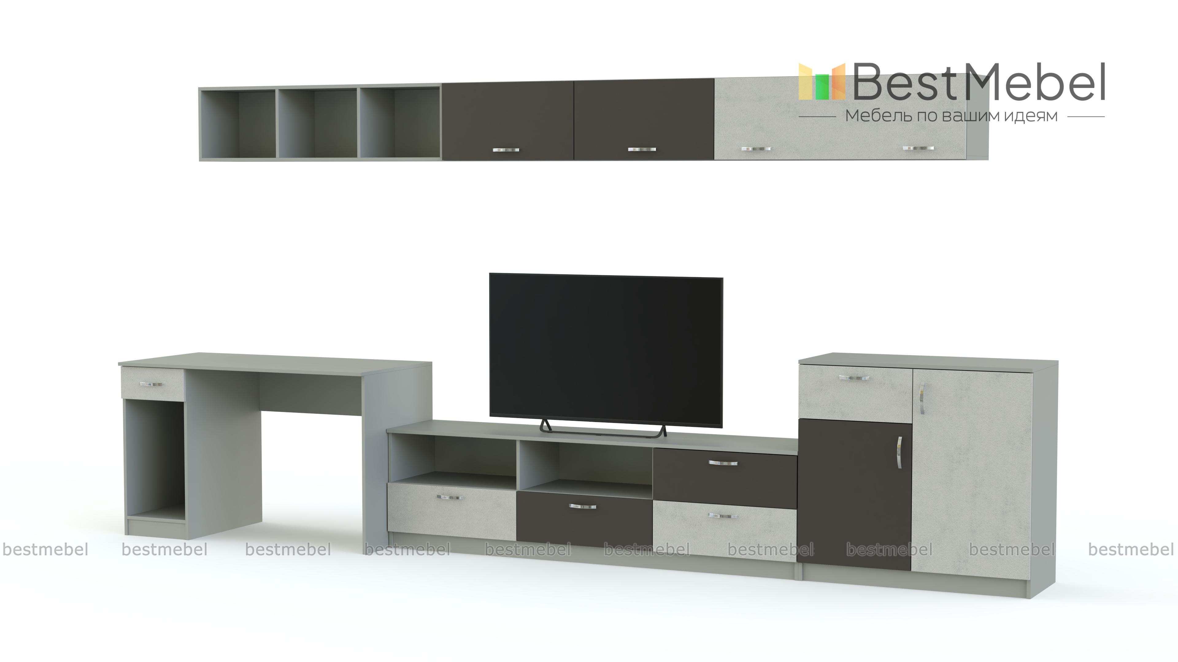 Стенка с рабочей зоной Мирикл BMS – это яркая минималистичная композиция для меблировки небольших современных гостиных, студий и молодежных комнат. Вы сможете объединить рабочее место с зоной размещения ТВ и значительно сэкономить пространство. Модульный комплект в контрастных тонах включает в себя компьютерный стол, низкую тумбу под аппаратуру, высокую тумбу и навесные полки с открытыми и глухими фасадами. Купить стенку с рабочей зоной Мирикл BMS приглашаем на сайт нашего интернет-магазина.