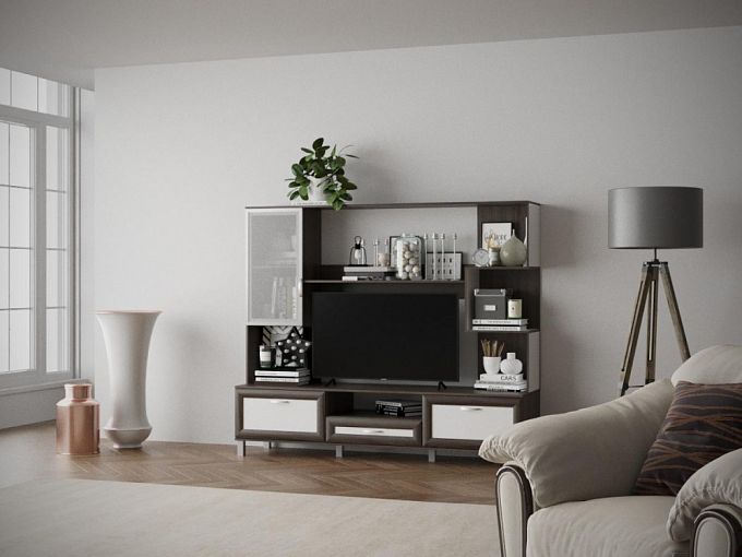 Гостиная Тиса-44 BMS, несмотря на скромные габариты, оборудована всем необходимым для удобного размещения видео- и аудиоаппаратуры, книг, интерьерных украшений и множества домашних мелочей. Компактная модель элегантной контрастной расцветки с рамочными фасадами оборудована тумбой под ТВ на регулируемых высоких опорах, стильной витриной с матовым стеклом и открытыми полками. Купить гостиную Тиса-44 BMS недорого вы всегда сможете в нашем интернет-магазине.