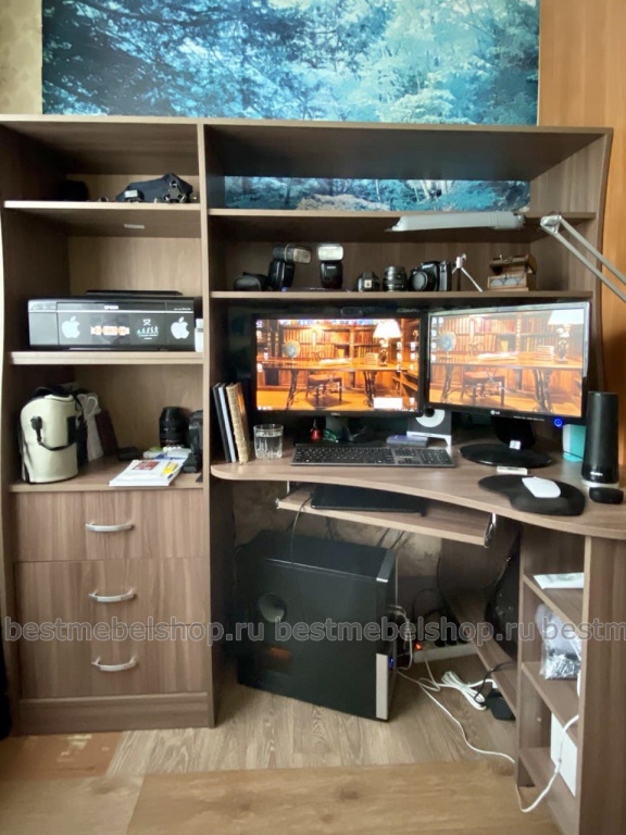 Стол выбирала из за функциональности и размера. Мне нужно было разместить 2 монитора и другую технику. Все уместилось и осталось место. На стеллажах можно разместить книги. Удобный, красивый. Собрали сами. Сложно, тк.много деталей, но возможно. Доставка сработала оперативно. После заказа привезли через 2 дня.Советую данный стол к приобретению.