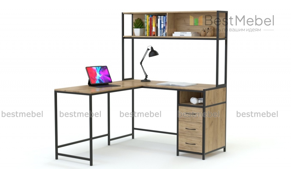 Компьютерный стол Флора 11 BMS – это широкая угловая модель, которая поможет организовать порядок на рабочем месте, и сохранить функциональность и стиль в интерьере. Стол оборудован надстройкой с просторной открытой полкой и удобную тумбу с выдвижными ящиками в основании. Гладкие фасады с имитацией текстуры дерева украшены черными ручками-кнопками, которые великолепно сочетаются с темным металлическим каркасом. Купить компьютерный стол Флора 11 BMS недорого с возможностью изменения фурнитуры вы сможете в нашем интернет-магазине.