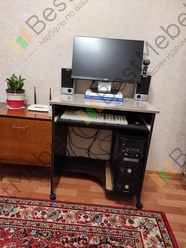 Заказ 00000896930. Отличный небольшой (700х750х500), мобильный, функциональный столик для небольшого помещения. На столешнице вполне помещается большой монитор, колонки. Удобная выдвижная полочка для клавиатуры и мышки, внизу полочка для системного блока. Столик устойчивый, качество хорошее. Есть возможность выбрать размеры и расцветку на сайте. Обработка заказа очень быстрая, доставили и собрали все вовремя.
