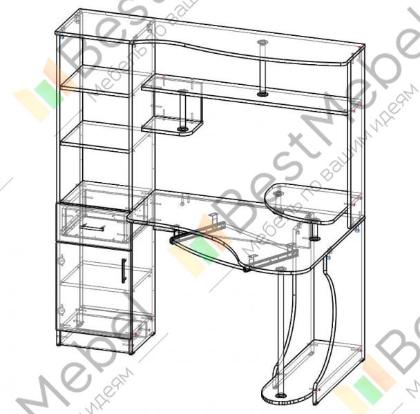 Многофункциональный компьютерный стол Вадим 2 придется по вкусу ценителям комфорта. Подойдет тем, у кого много бумажной работы, так как состоит стол из 4-х открытых полок, рабочей зоны, полки для монитора, выдвижной ниши для клавиатуры, панели для системного блока. Слева находится небольшой шкафчик с открытыми и закрытыми полками для рабочих материалов. Расцветку изделия можно выбрать самостоятельно, благодаря шикарной палитре, которую Вы найдете на сайте. Тут же можно заказать само изделие.