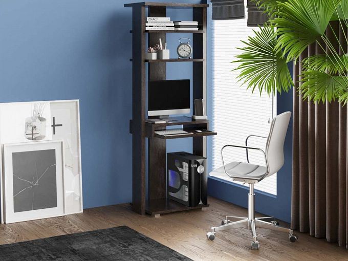 Модель очень оригинальная, предназначена для оборудования рабочего места, при значительной экономии свободного пространства. Стол представляет собой высокую тумбу оригинальной формы. Небольшое рабочее место вполне комфортное. Компьютерный стол КС 20-38 BMS имеет дополнительно две большие полки, на которых комфортно разместятся диски, книги и т.д. Купить такую модель вы можете, изменив изначальные параметры модели и подобрав цвет под остальную обстановку.