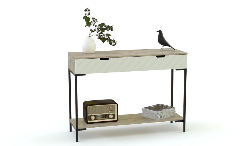 Консольный стол Клора 10 BMS – это актуальный дизайн в стиле лофт и практичная конструкция. Прямоугольный столик оборудован просторной столешницей, под которой располагаются два выдвижных ящика для хранения мелочей, и открытой нижней полкой. В оформлении модели скомбинированы корпус теплого крафтового оттенка и платиновый фасад с фрезеровкой, а устойчивость и легкость конструкции обеспечивают опоры из металлического профиля. Купить консольный стол Клора 10 BMS вы сможете по доступной цене на сайте нашего интернет-магазина.