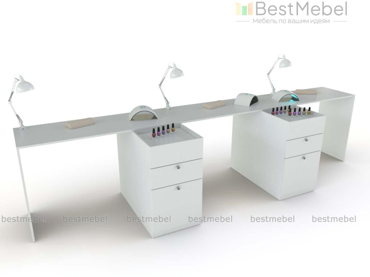 Маникюрный стол Оливия BMS сочетает в себе необходимые мебели для современного салона универсальный дизайн и эргономичность. Модель, предназначенная для одновременной работы трех мастеров, оборудована просторной прямоугольной столешницей, разделенной двумя тумбами с выдвижными ящиками и углублениями под лаки и инструменты. Со стороны клиента в тумбах имеются практичные ниши для сумок. Купить маникюрный стол Оливия BMS вы сможете в нашем интернет-магазине с учетом оптимальных параметров.