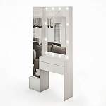 Необычный комплект с подсветкой светодиодными лампочками будет прекрасным дополнением современного спального гарнитура. Комфортное размещение средствам для макияжа и многому другому обеспечат два выдвижных ящика и полки бокового шкафа. Но особенно интересно в этой модели нестандартное решение зеркальной дверцы, которая в закрытом виде представляет собой зеркало в полный рост, редкое в туалетных столиках, а в открытом становится единым полотном с боковиной. В белом цвете столик Mak BMS смотрится легким и элегантным.