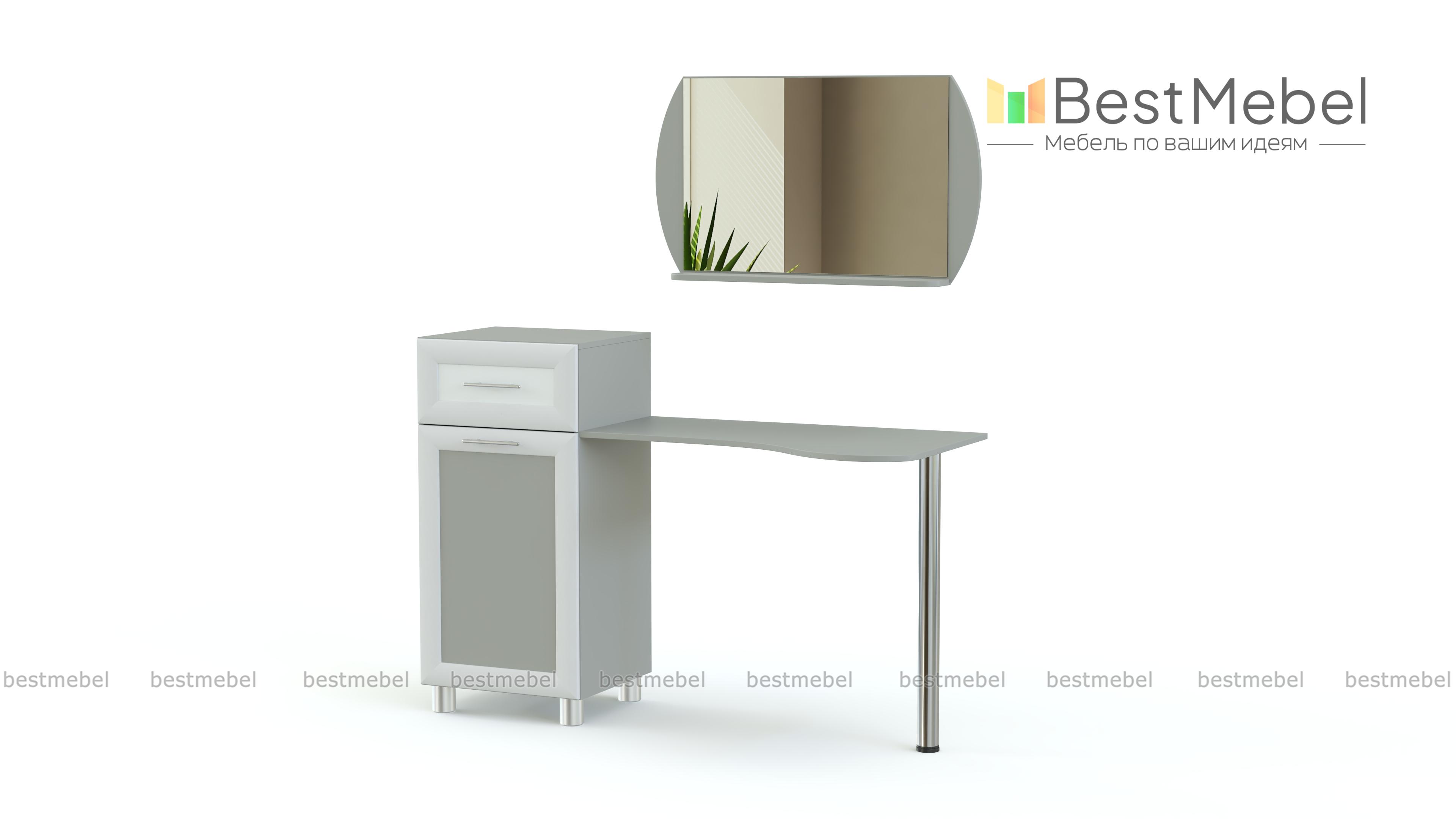 Туалетный столик Мелисса СТ 814 BMS – многофункциональная модель, которая совмещает рабочую поверхность эргономичной формы с удобной системой хранения. Устойчивая конструкция с хромированной опорой с одной стороны и тумбой с другой станет практичным дополнением комплекта для спальни в современном стиле. Благодаря выдвижному ящику и просторному отделению с полкой вы сможете разместить как аксессуары, так и разнообразные уходовые средства. Купить туалетный столик Мелисса СТ 814 BMS, подобрав цветовое решение, приглашаем в наш интернет-магазин.