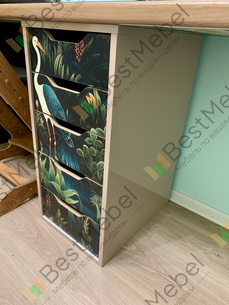 в этом заказе всё индивидуально: глянцевый корпус, в т.ч. задняя стенка, скрытые крепежи, шариковые направляющие с доводчиком, фотопечать, материал мдф. Получилось мощно! Мы довольны. Выполняет функцию разделителя под детским столом.