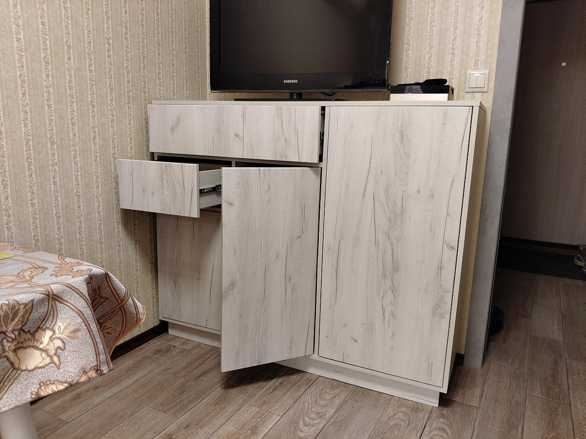 Тумбу заказали в своих размерах и цвете дуб крафт белый. В целом, мы ей очень довольны. Быстрое изготовление, отсутствие царапин и сколов, тактильно приятный материал. В процессе сборки возник вопрос. Почему "задняя стенка ДВП в паз" состоит из 3 частей? Ожидали ее цельной или хотя бы из 2х частей, чтобы верх и низ фиксировался в пазах. И, конечно, хотелось бы более подробную инструкцию по сборке. Для тех, кому может понадобится, прилагаю размеры упора-защелки с толкателем, чтобы правильно выставить его на дверцах и ящике.