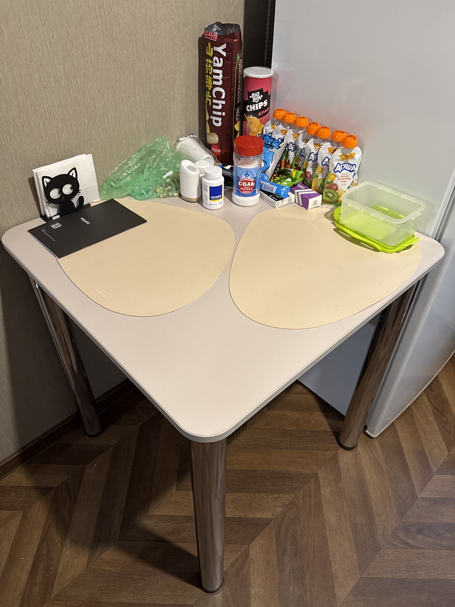 Хороший, компактный стол. Заказывал на маленькую кухню 5,5 м2. Встал отлично! Цвет тэффи л и толстая кромка. Отверстия под ножки не засверлены изначально.
