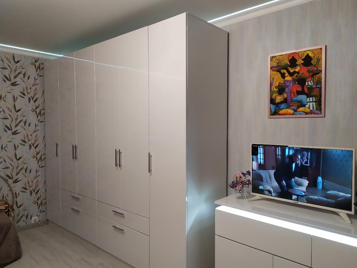 Отлично вписалась в интерьер, выбрали высоту по необходимости. При сборке попросили не прибивать заднюю панель, на наш взгляд получилось симпатично. Очень довольны, двери достаточно прочные, раздвижной механизм открытия работает отлично без нареканий, пользуемся пол года. Спасибо!