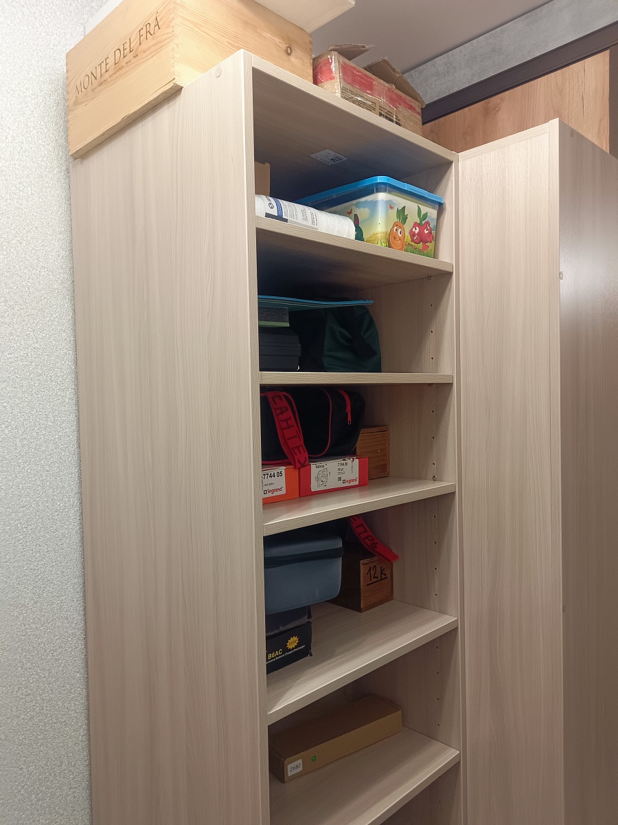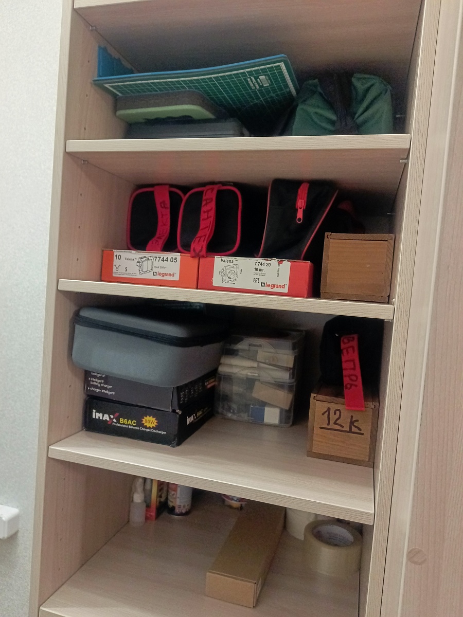 Брали стеллаж с двумя блоками ящиков вместо полок. Удалось немного разобрать и разложить мужские игрушки.