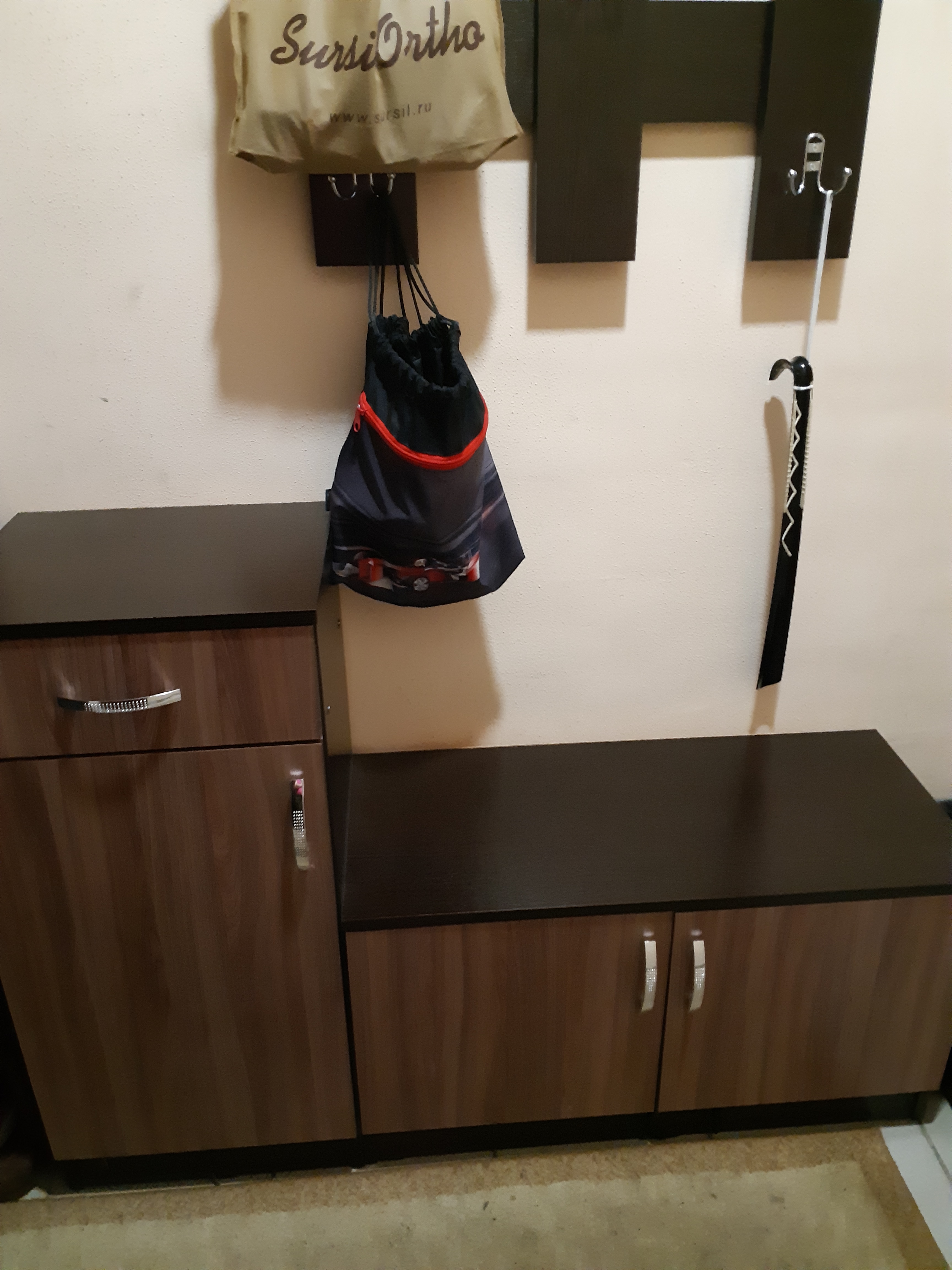 Заказала прихожую через сайт. В магазин не ходила. Удобно. Сотрудники сразу оформили заказ, созвонились. Сообщили приблизительно день доставки и привезли во время. Все детали упакованы хорошо. Собирали сами, брака не было. Отверстия при сборке совпадали. Искали маленькую прихожую за небольшие деньги.Нашли,  да еще можно цвет подобрать! И фурнитуру изменить. Все устроило. Спасибо.Дизайн: хорошоУдобство:хорошоКачество:хорошо